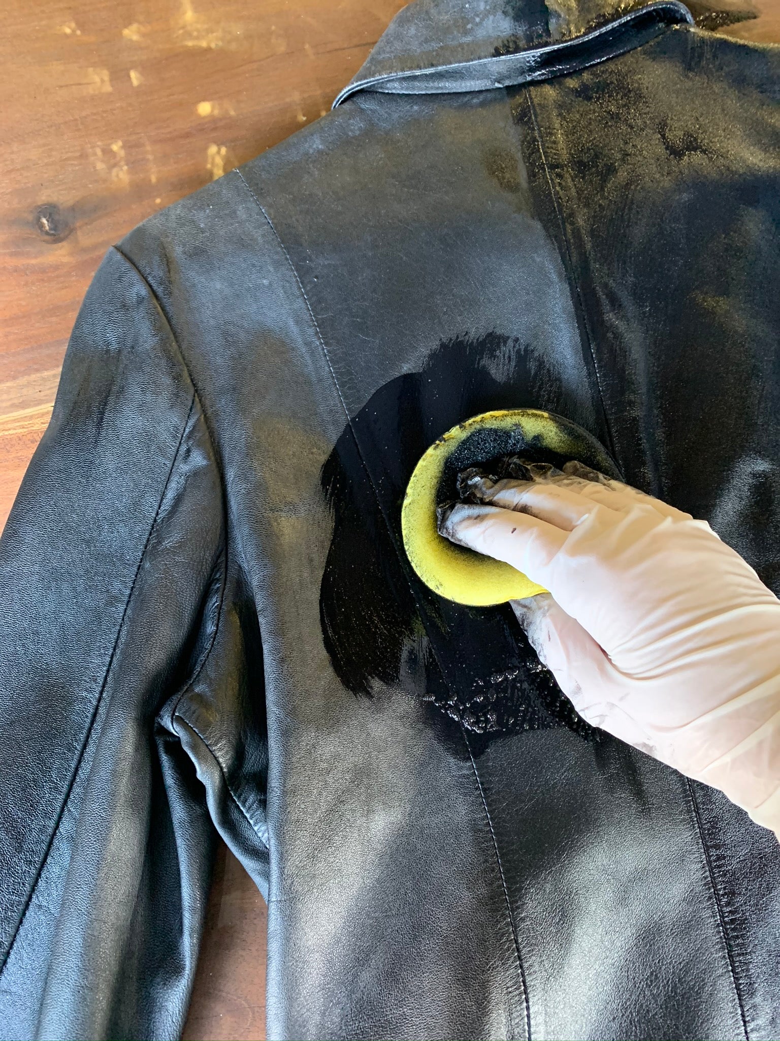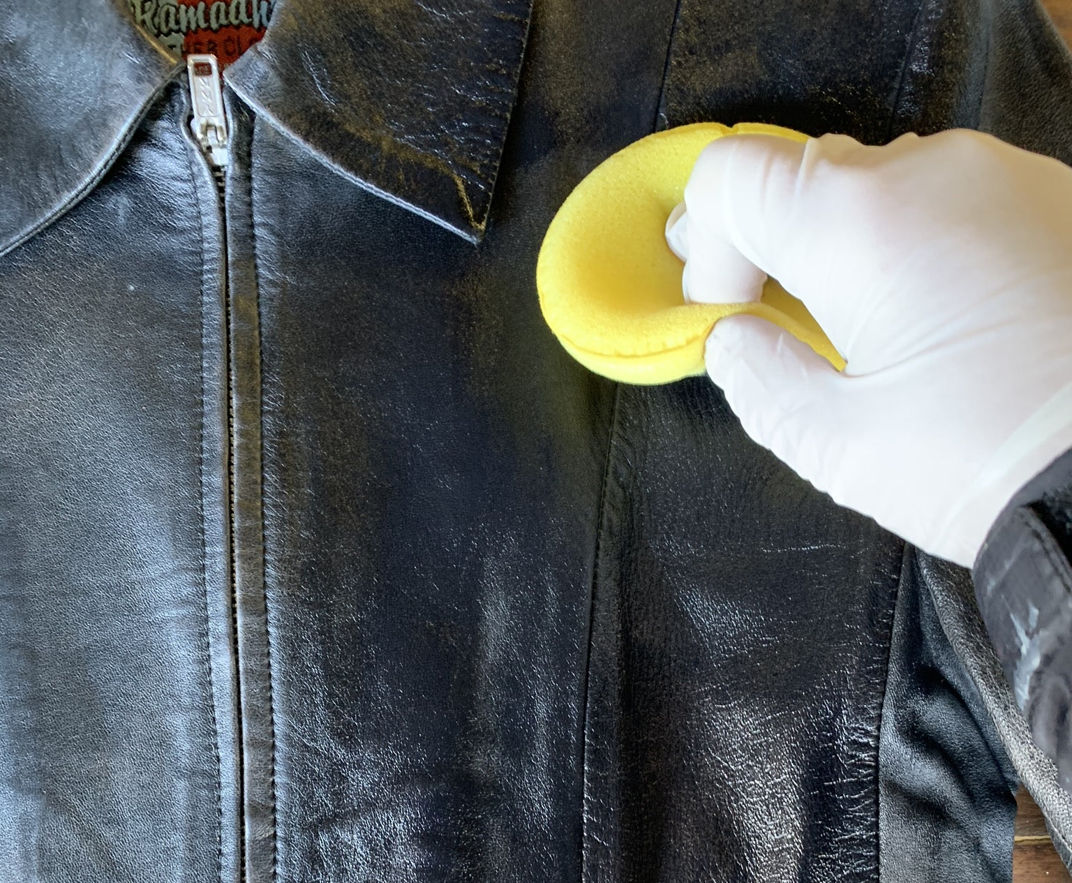 3) Do a test spot of Black Jacket Reviver in an inconspicuous area, eg; the lower inside facing. to ensure compatibility with your leather and objectives.